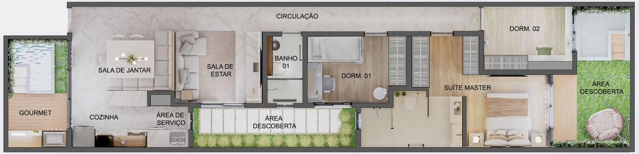 Apartamento com 03 dormitórios, sendo 01 suíte e 02 dormitórios convencionais, banheiro social, sala ampla integrada à cozinha e sala de jantar, proporcionando um ambiente moderno e funcional.