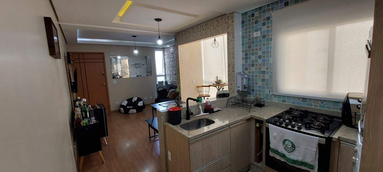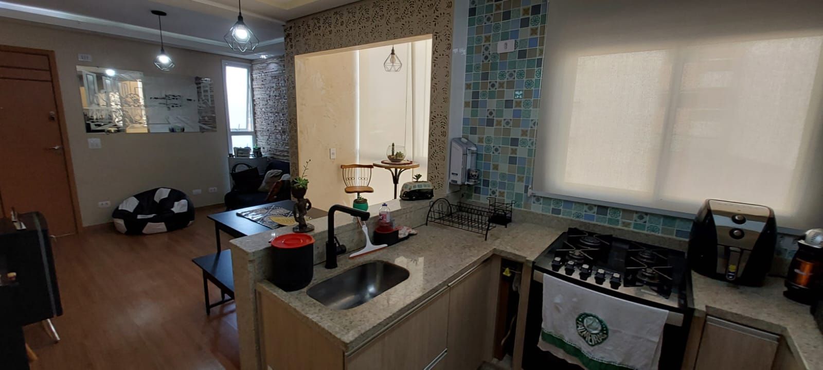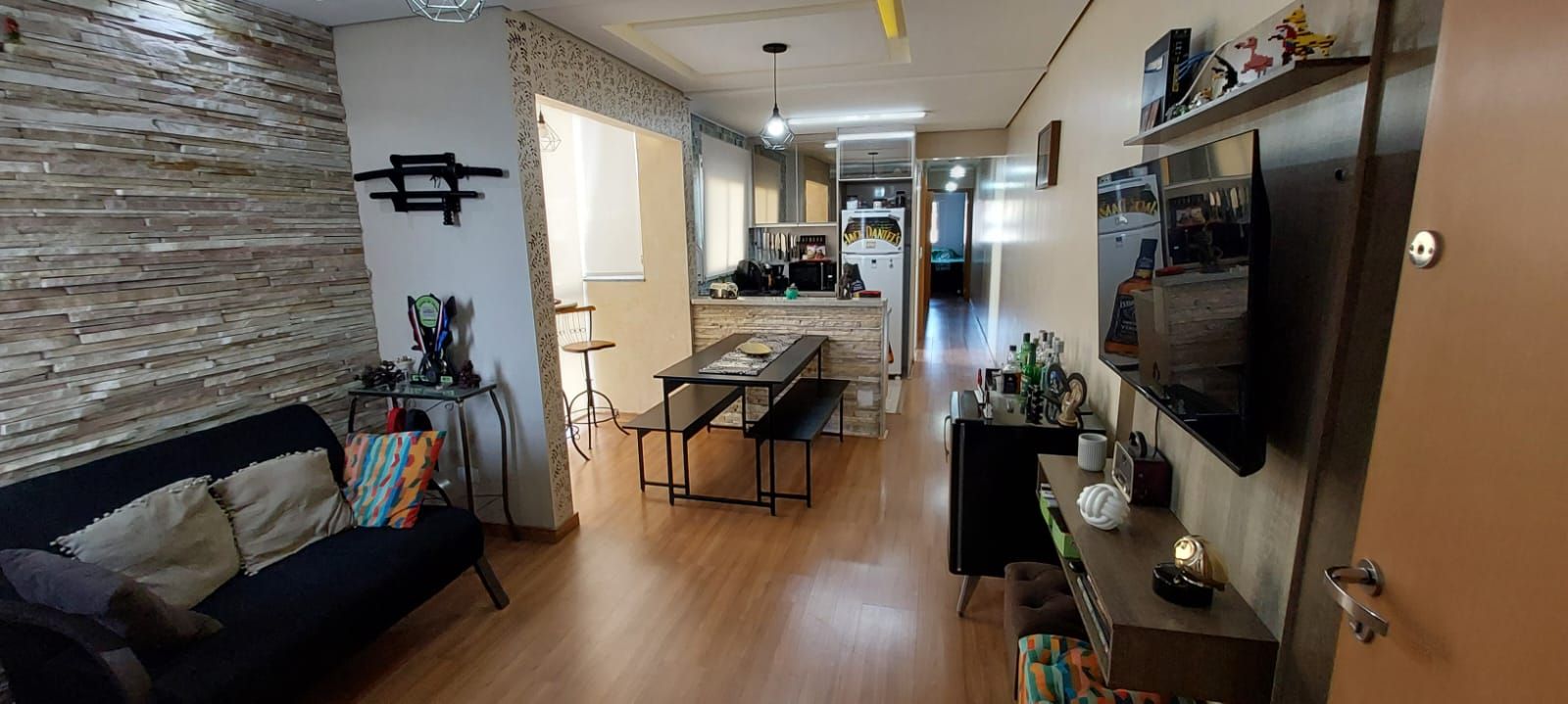 A sala é aconchegante e integrada à cozinha, que conta com armários planejados, fogão e forno embutidos, torneira aquecida e piso laminado, proporcionando um ambiente moderno e funcional. A lavanderia é prática e bem ventilada.