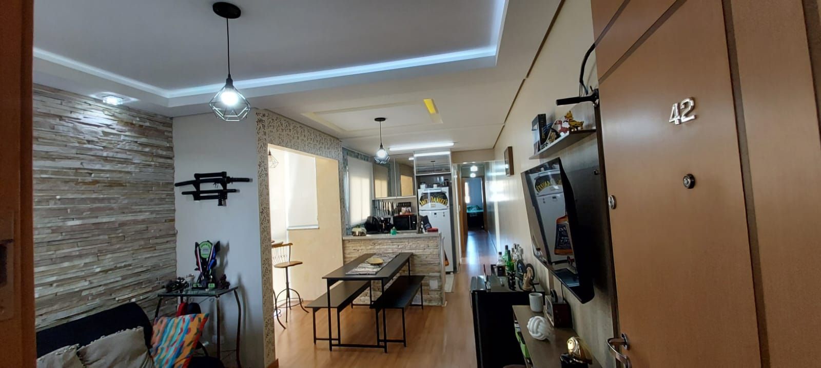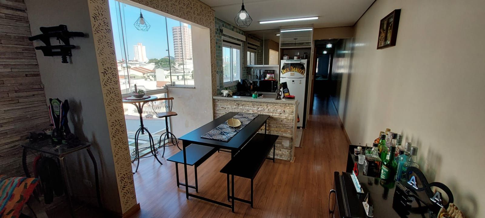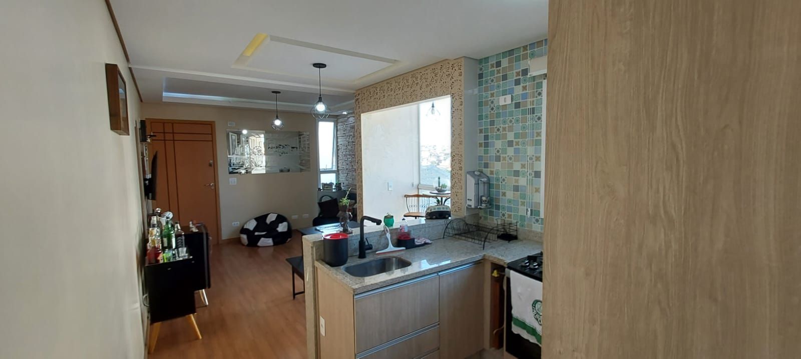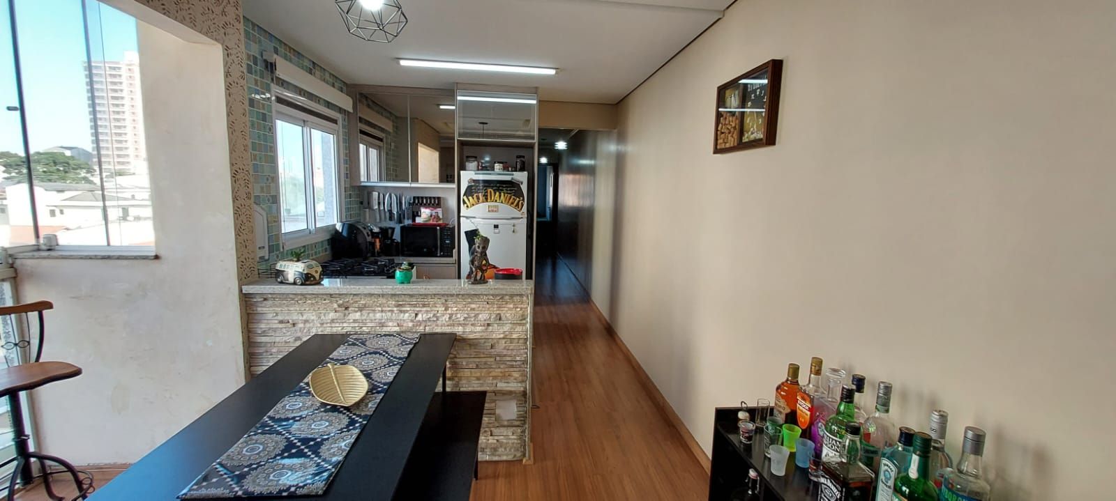 A sala é aconchegante e integrada à cozinha, que conta com armários planejados, fogão e forno embutidos, torneira aquecida e piso laminado, proporcionando um ambiente moderno e funcional. A lavanderia é prática e bem ventilada.