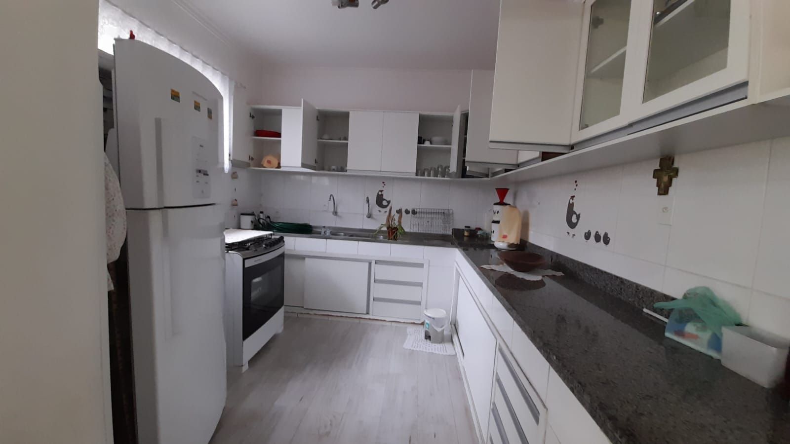 No total, é composto por 4 dormitórios, 3 banheiros, 2 salas amplas, 2 cozinhas, área de serviço e um amplo quintal.