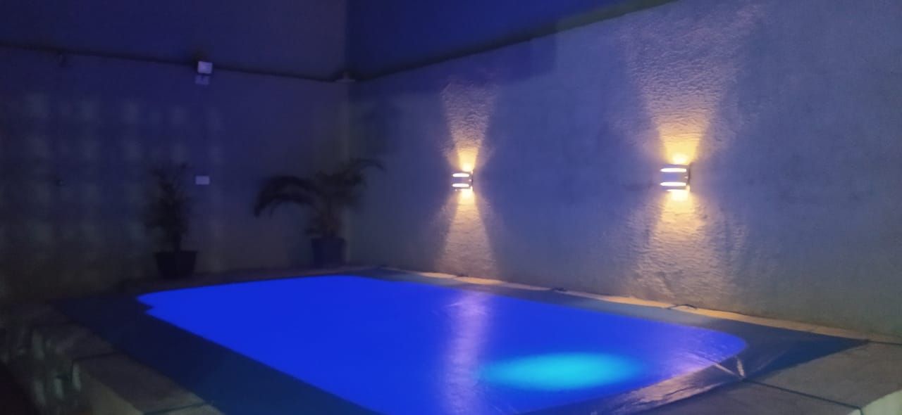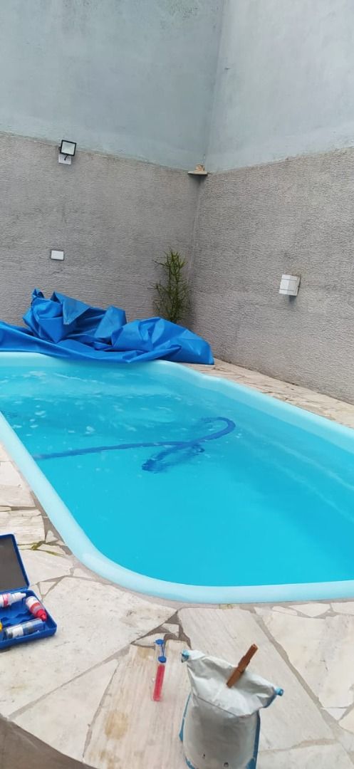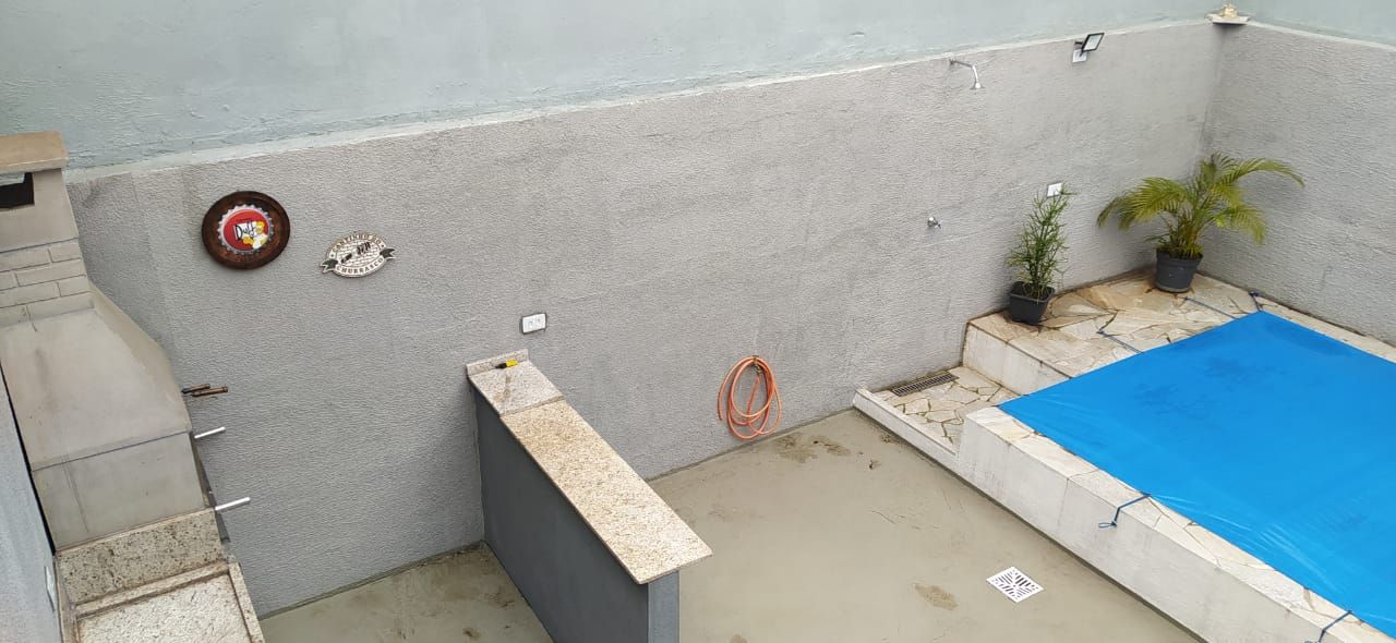 Ampla área externa com piscina, churrasqueira e vagas para até 5 veículos (3 cobertas e 2 descobertas).